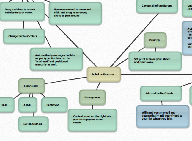 ブラウザーで使えるマインドマップも多数存在する。検索していただければ分かるが、プレゼンなどにも利用できそうななものから、シンプルなマッピングのみのものまである。私はbubbl.usが気に入った。理由はシンプルだから。やっぱり思いつきを視覚的に残したいときにあまり複雑な要素は不要だ。以下はそのスクリーンショット。