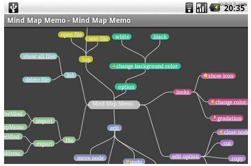 アンドロイド用のアプリに”Mind Map Memo”なるものが登場した。あくまでも直感的なインターフェースにこだわっており、無駄なものはない。ズームやコピー・ペースト、セーブもできる。セーブは特に保存操作をしなくても、アンドロイドのホーム画面に移動するときに自動保存される。Nodeの色も自由に変えられる。以下はAndrolib.comからのスクリーンショット。