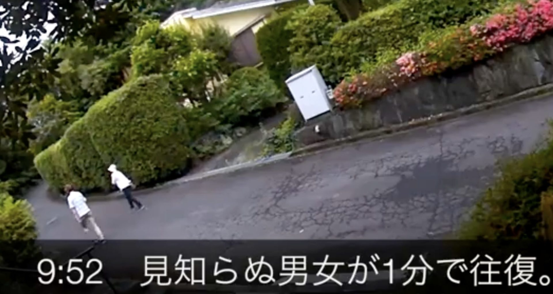 0:33 見知らぬ男女が1分で往復する。復路の時は顔を背ける。