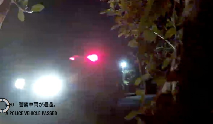 * 警察車両が通過。