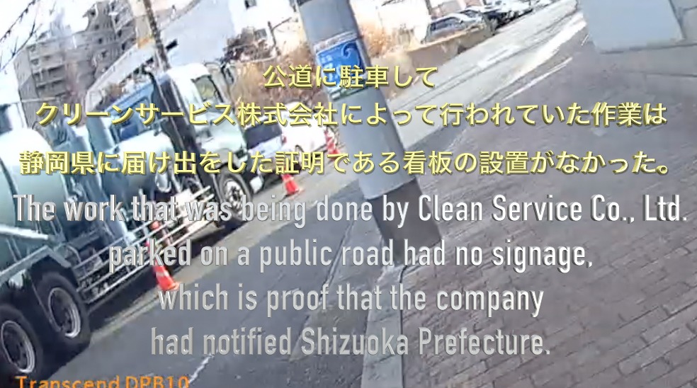 * 公道に駐車してクリーンサービス株式会社によって行われていた作業は静岡県に届け出をした証明である看板の設置がなかった。