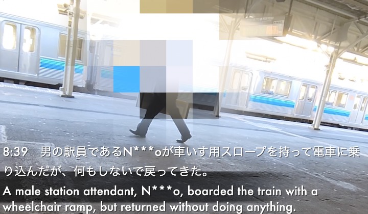 8:39 男の駅員であるN***oが車いす用スロープを持って電車に乗り込んだが、何もしないで戻ってきた。
