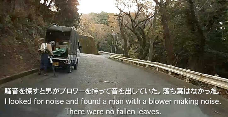 * 騒音を探すと男がブロワーを持って音を出していた。落ち葉はなかった。