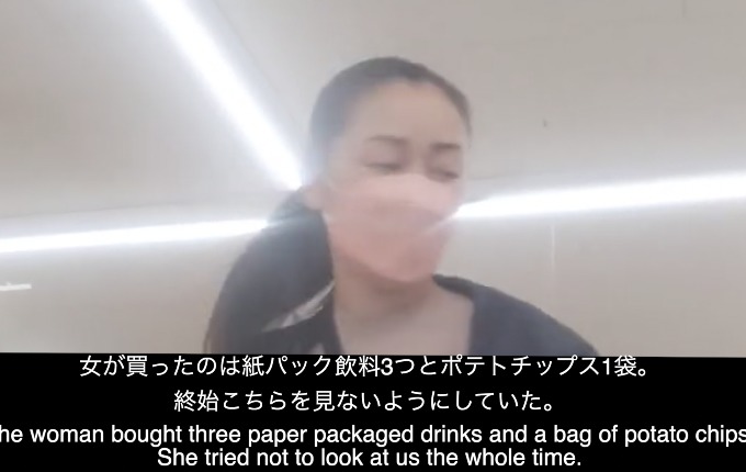 * 女が買ったのは紙パック飲料3つとポテトチップス1袋。終始こちらを見ないようにしていた。