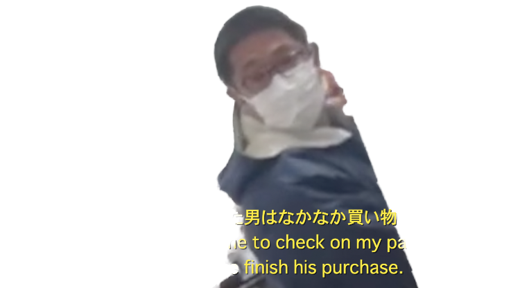 * 私の支払いの様子を見に来た男はなかなか買い物を終えなかった。