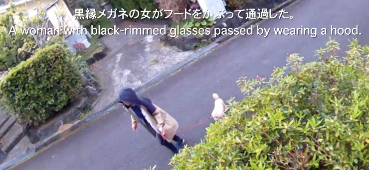 * 黒縁メガネの女がフードをかぶって通過した。
