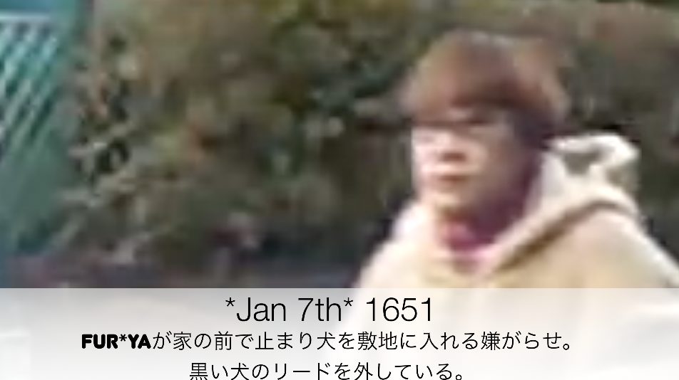 1651 Fur*yaが家の前で止まり犬を敷地に入れる嫌がらせ。黒い犬のリードを外している。
