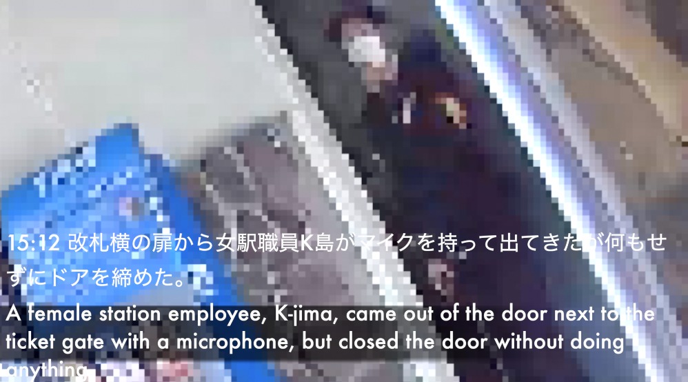 15:12 改札横の扉から女駅職員K島がマイクを持って出てきたが何もせずにドアを締めた。
